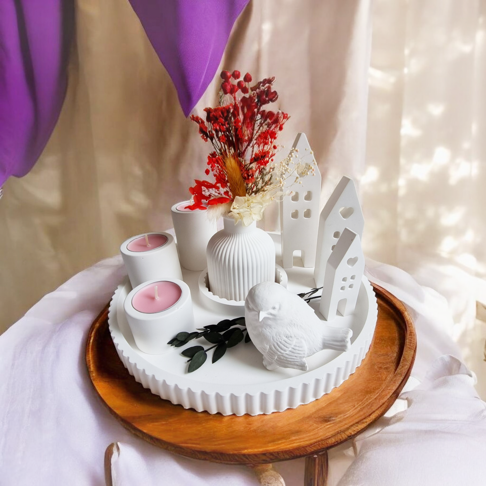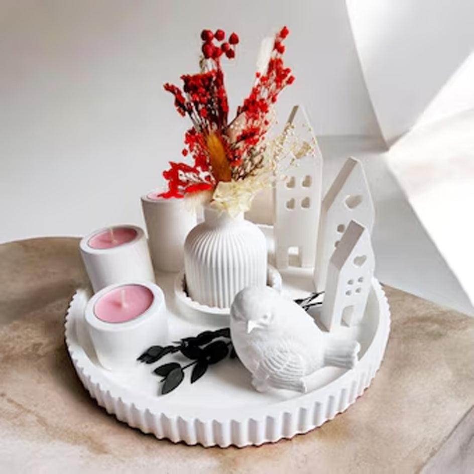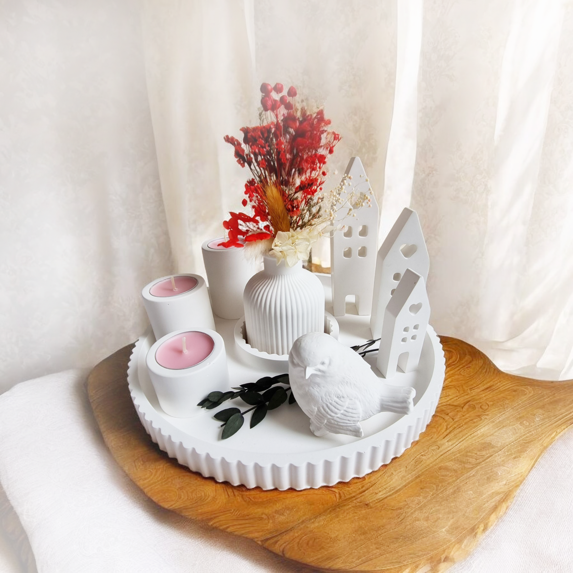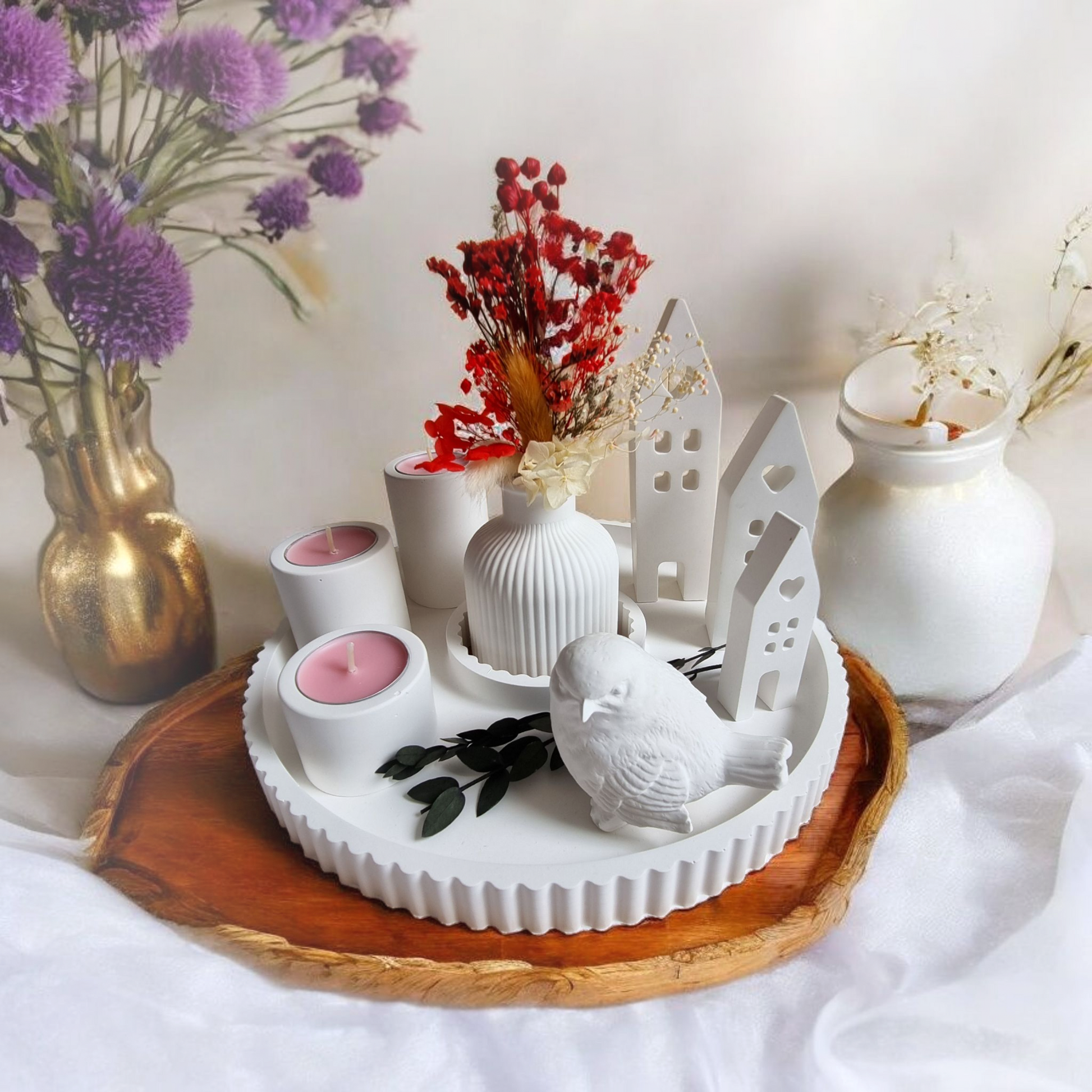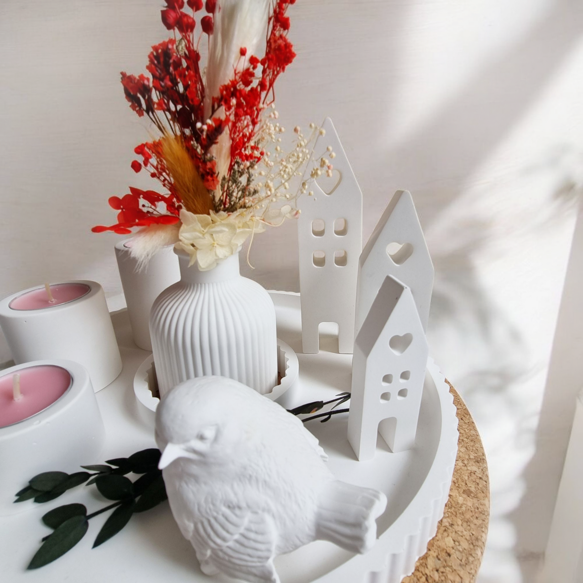 Elegant und minimalistisch, so ist unser Daydream Set. Komplett mit einer Vase für Trockenblumen, drei Teelichthaltern, drei Häusern und einem Vogel aus Raysin. Egal ob einzeln oder im Set, es gibt eine ganz wundervollen Blickfang in jeder Wohnung.