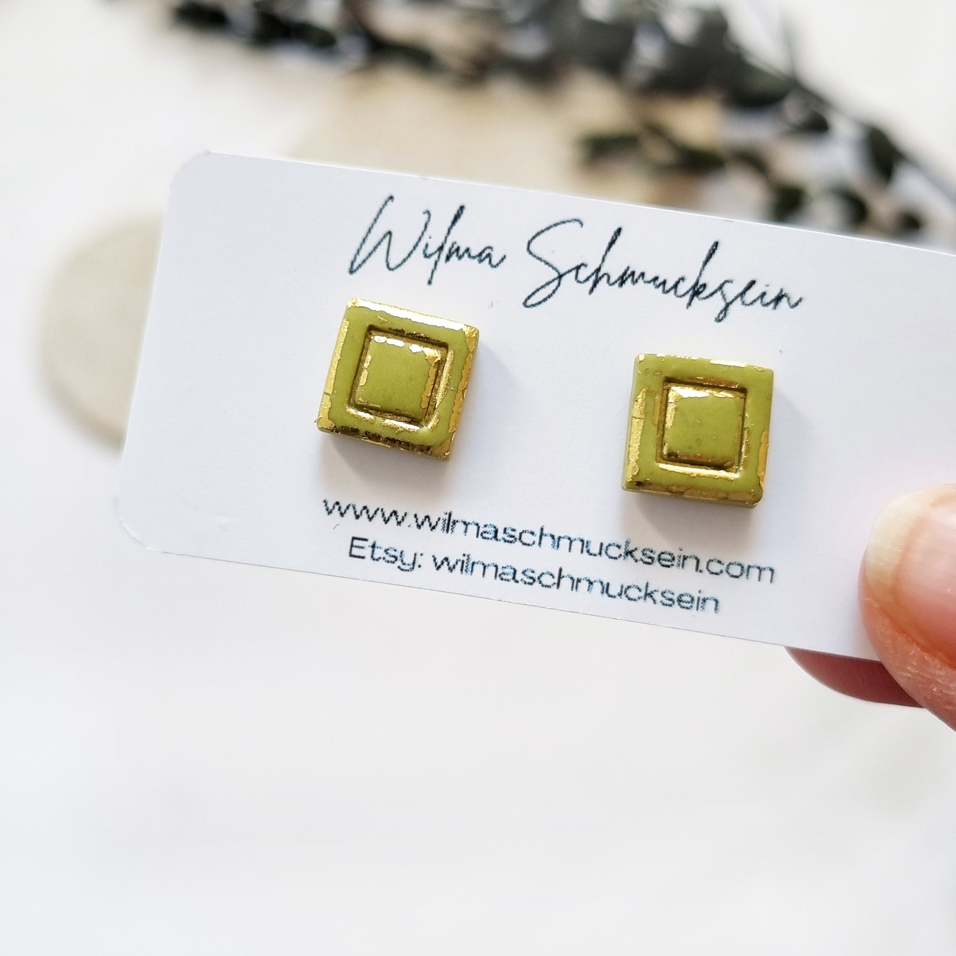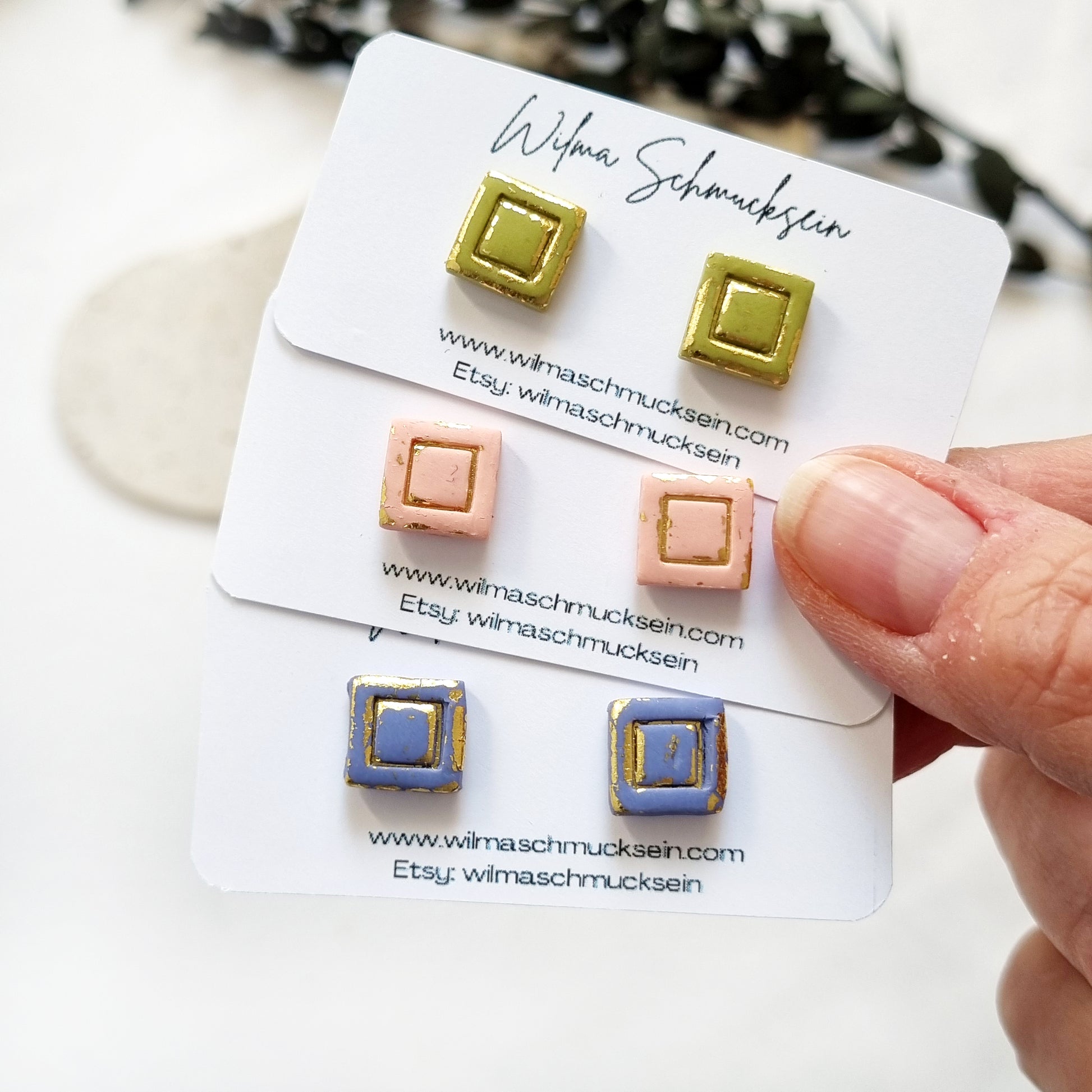 Darf ich euch unsere goldigen quadratischen Polymer Clay Ohrstecker vorstellen? Zauberhaften Polymer Clay Ohrstecker in verschiedenen Farben.