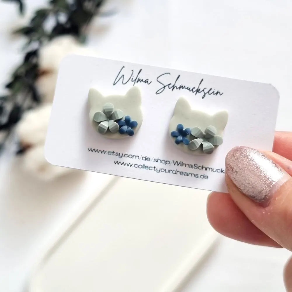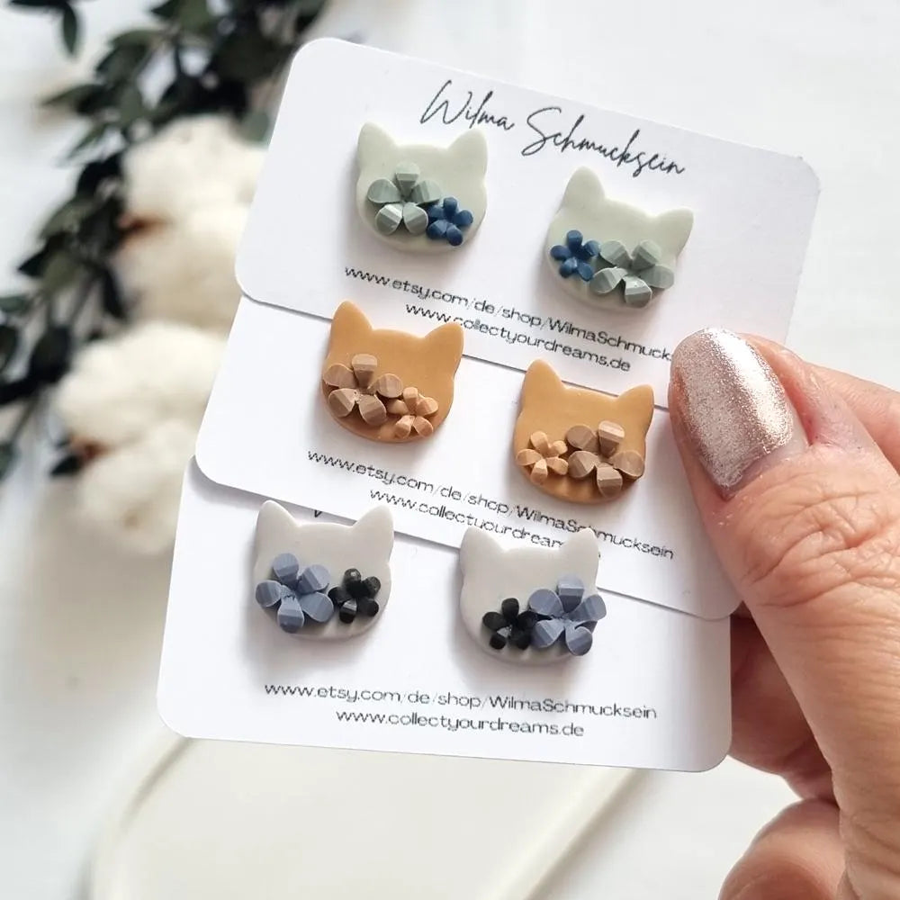 Darf ich euch unsere kleinen zauberhaften Katzenkopf Polymer Clay Ohrstecker vorstellen? So hübsche Katzenohrringe mit Blumen verziert.