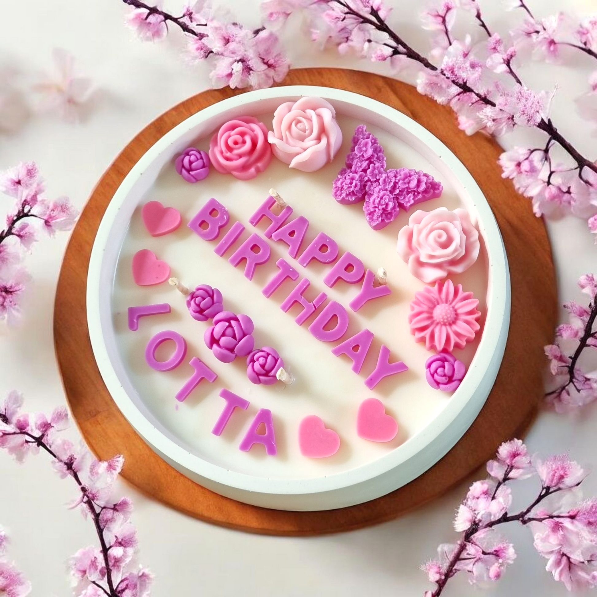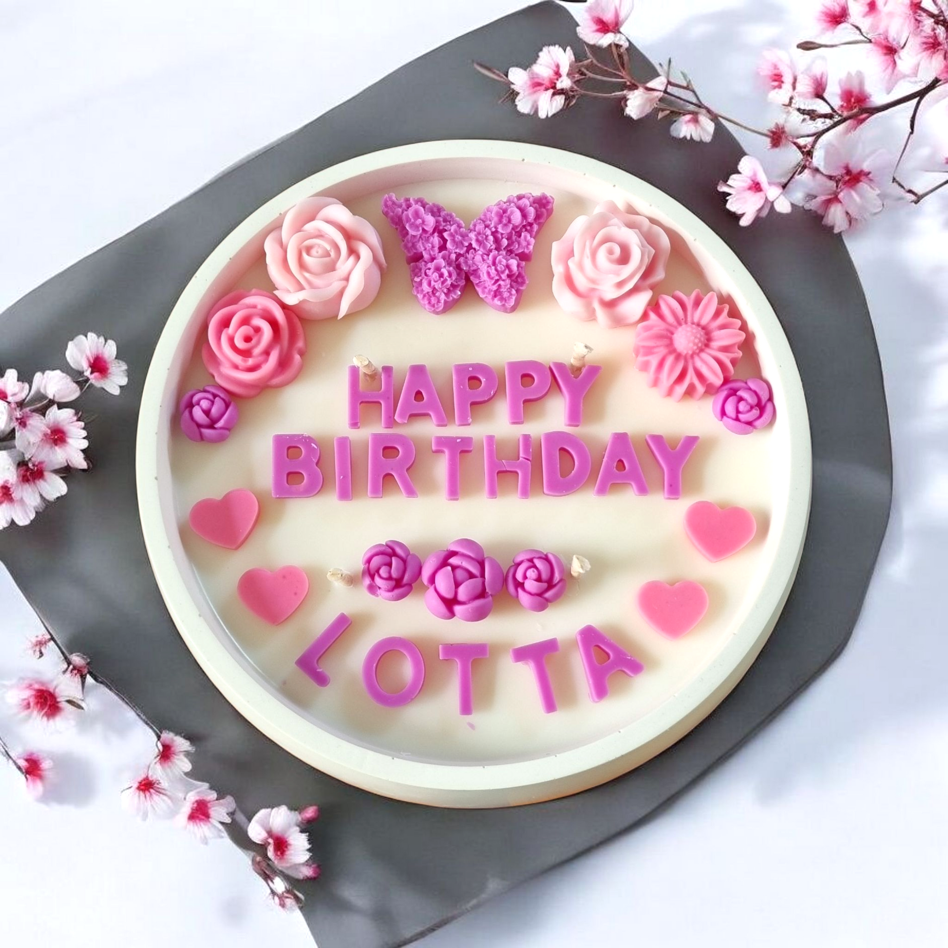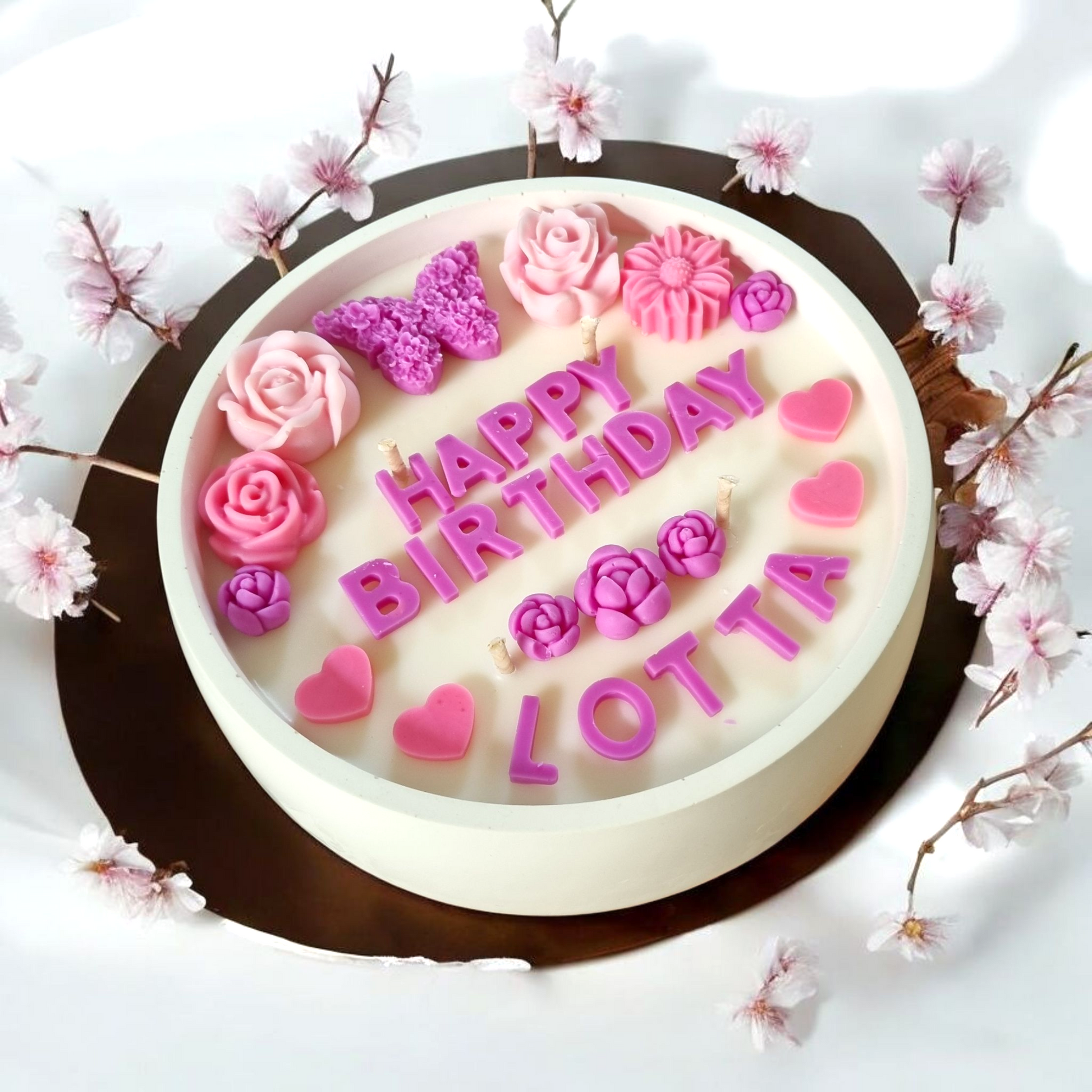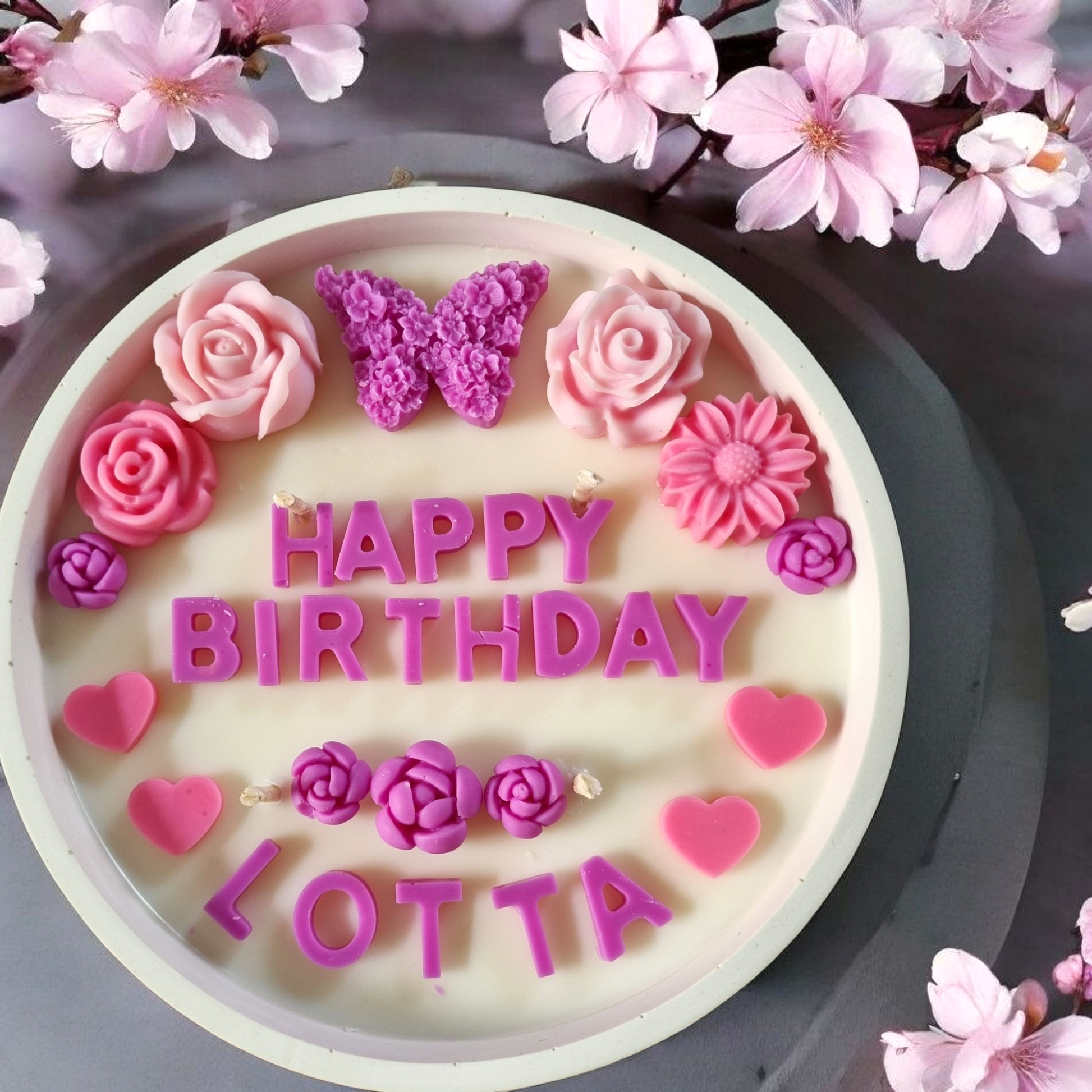 Eine unvergessliche Geburtstagskerze mit Namen, die auf jeden Fall in Gedächtnis bleibt. Hergestellt aus Bio Sojawachs uns kleinen zauberhaften Blumen und einem Schmetterling. Die Blumenschale hat einen Durchmesser von 17 cm und ist 6cm hoch. .