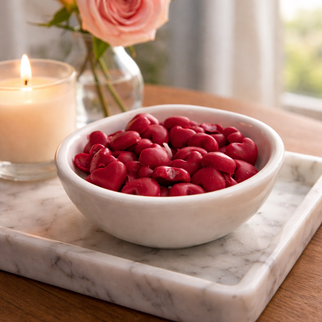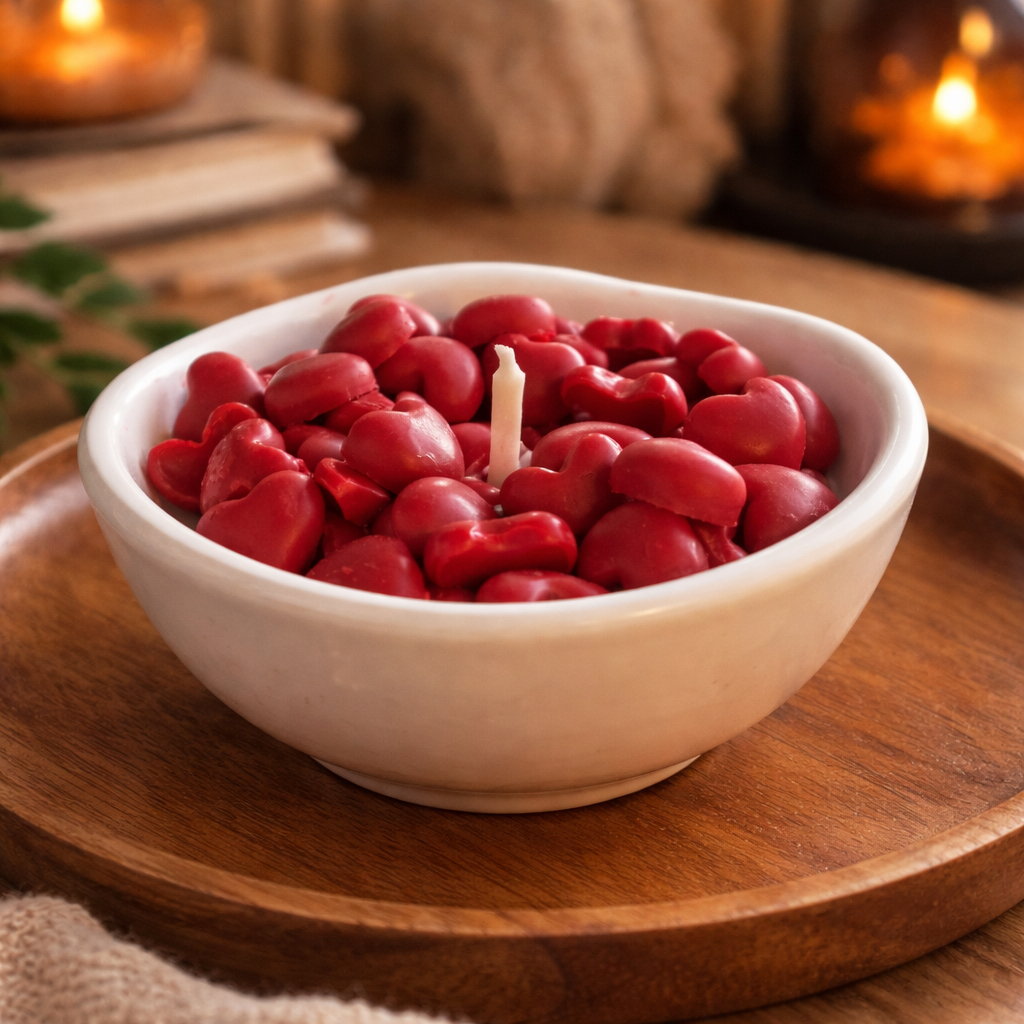 Unsere kleine Valentins Kerze für alle, die sich ein wenig Liebe ins Haus holen oder verschenken möchten. Kleine Raysin Schale mit Bio Sojawachs und kleinen Wachs-Kaffeebohnen. Die Kerze hat keine Duftnote.