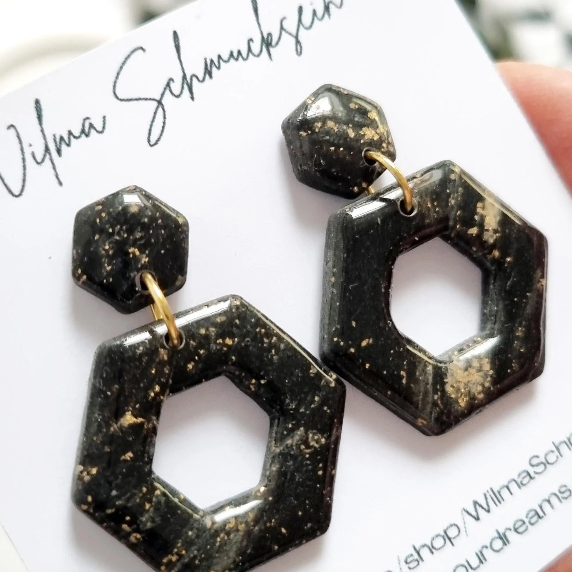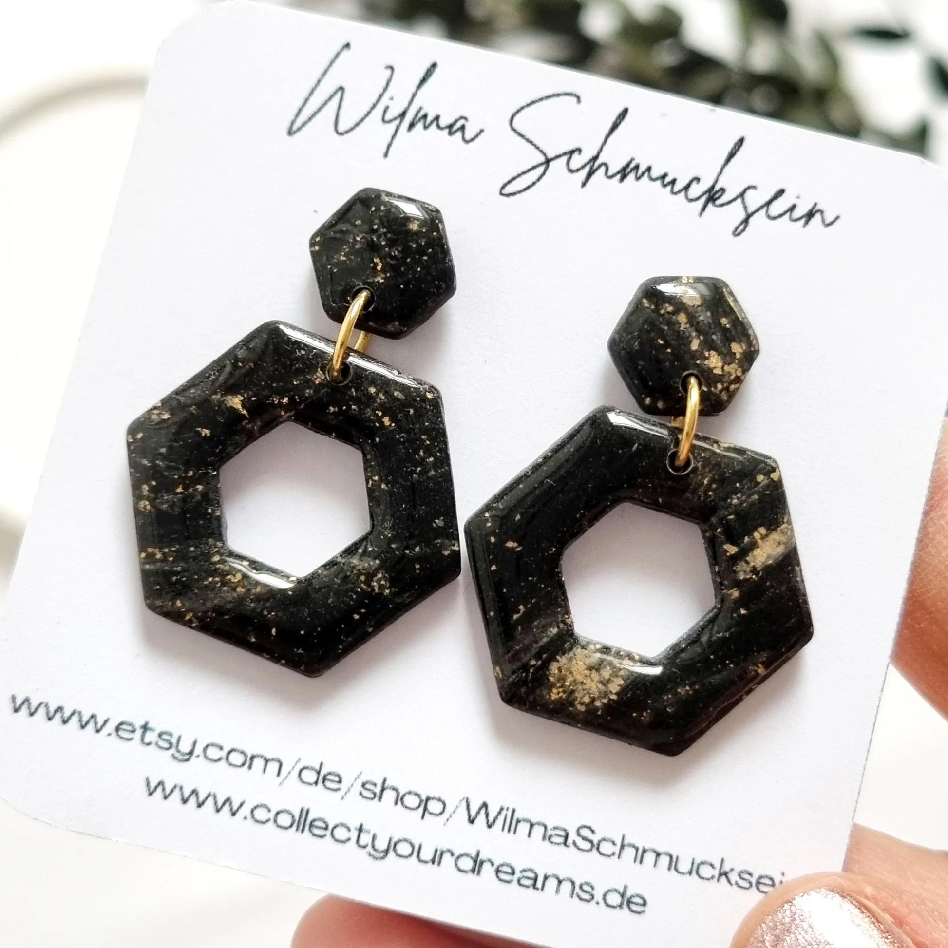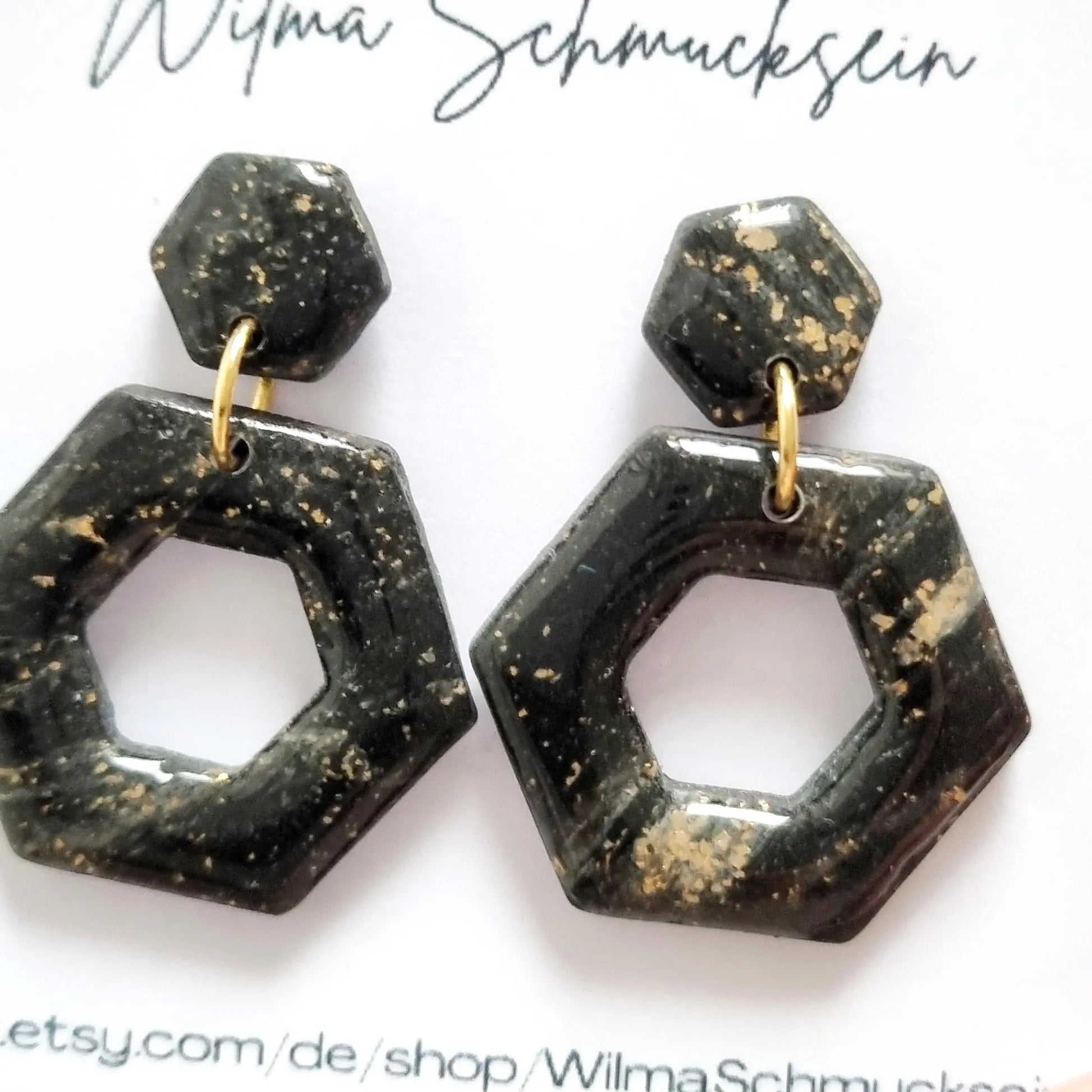 Zauberhafte schwarze Sechseck Polymer Clay Ohrringe mit Blattgold. Wunderschöne Polymer Clay Ohrringe an einem Edelstahl Stecker.