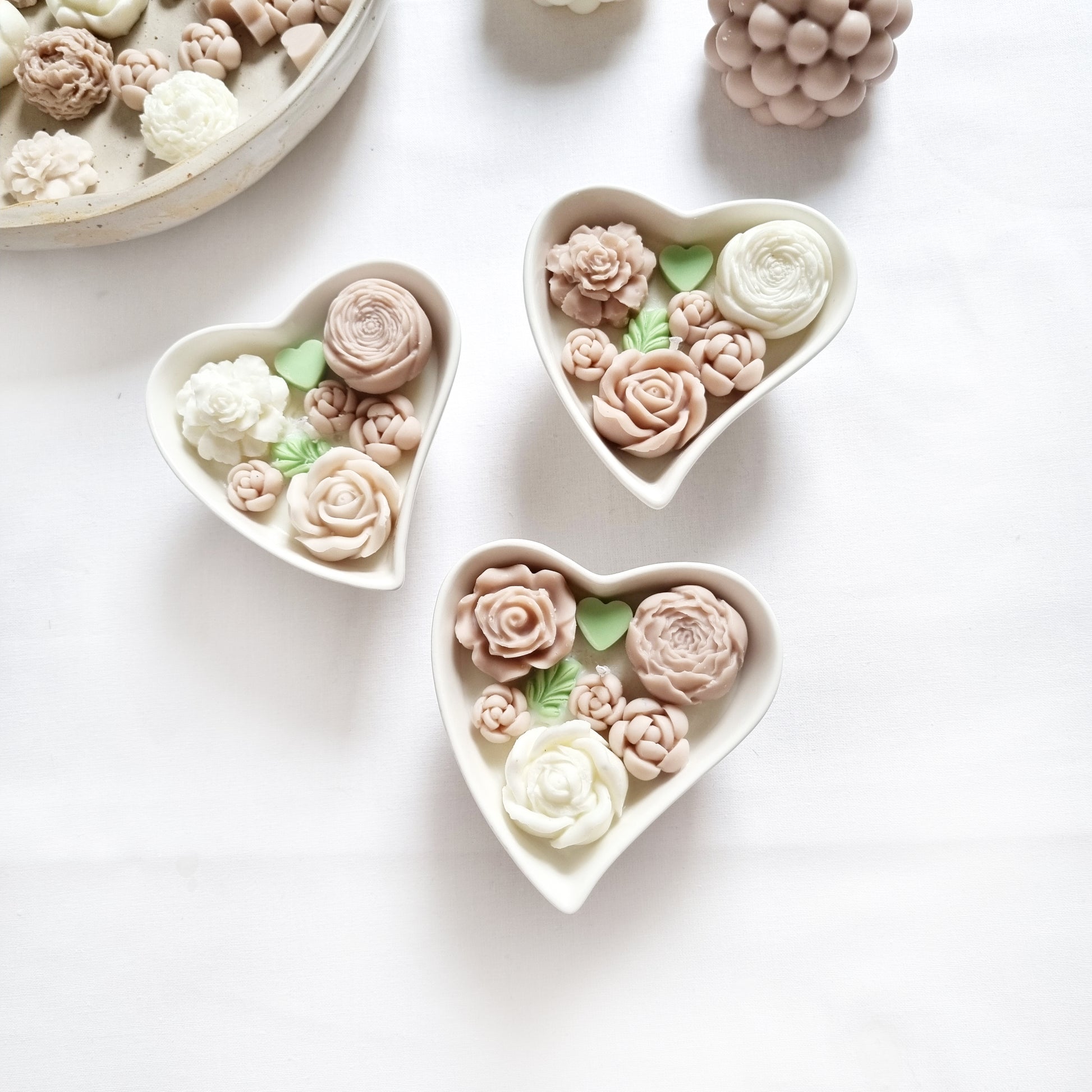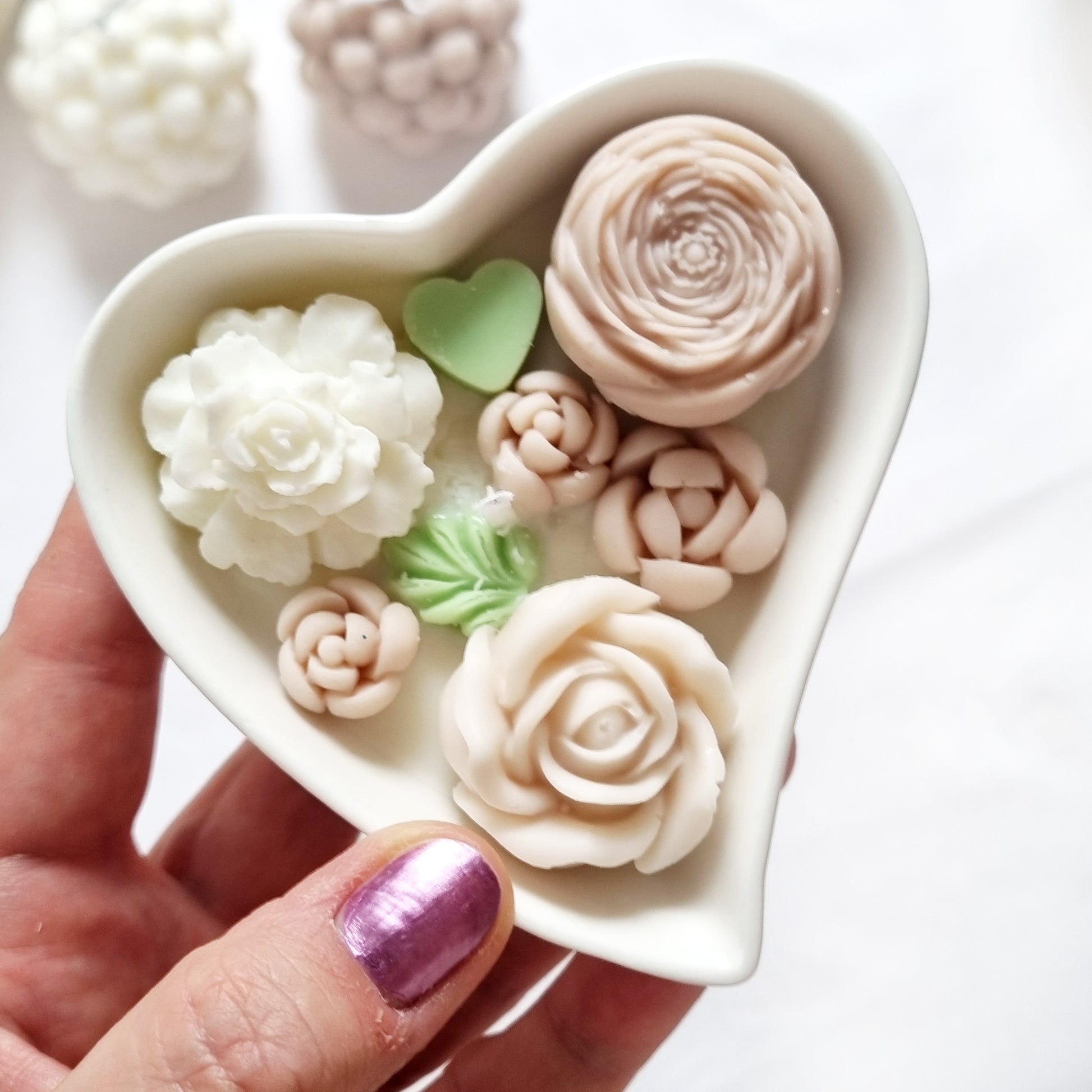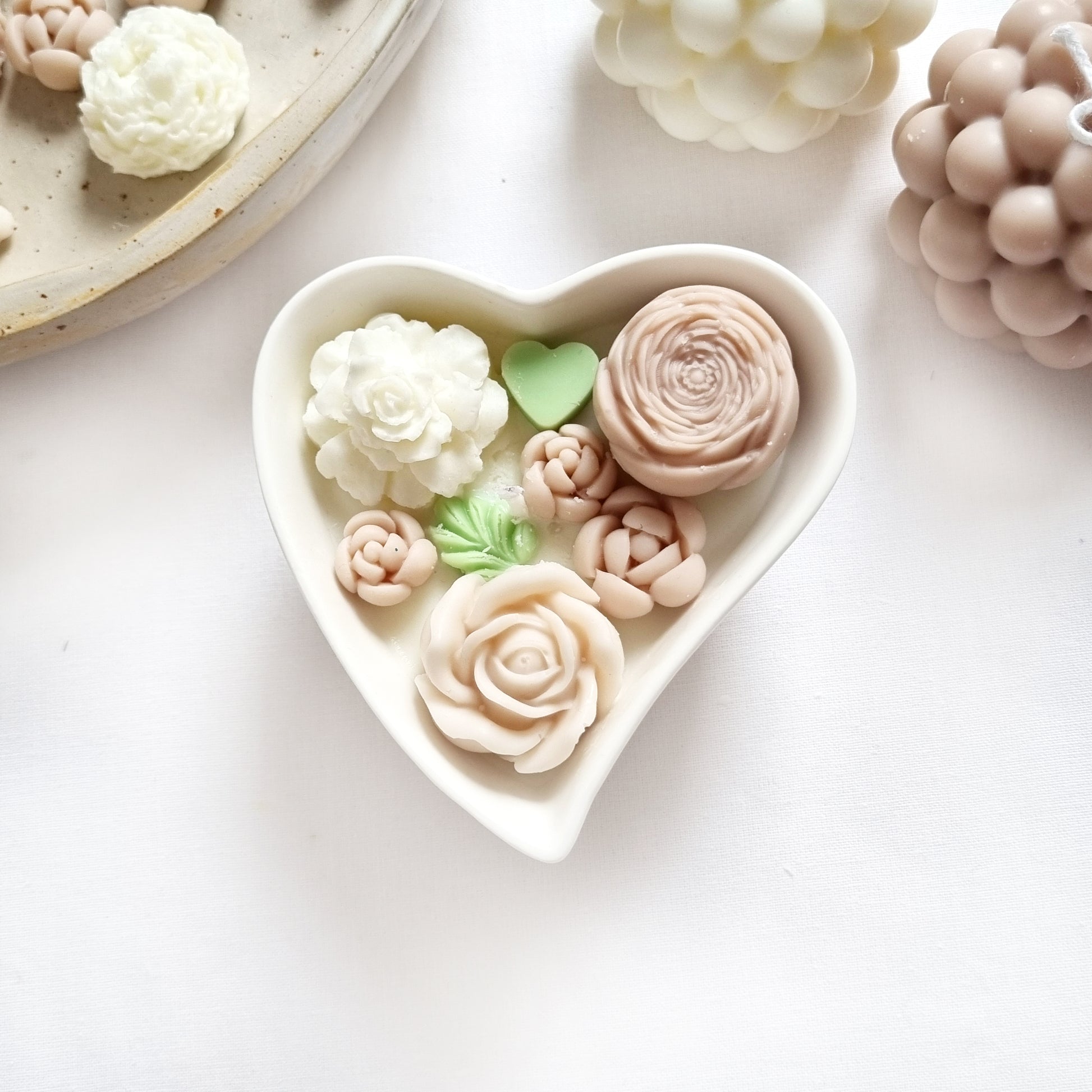 vegane Sojakerze mit Blüten in dekorativer Herzschale