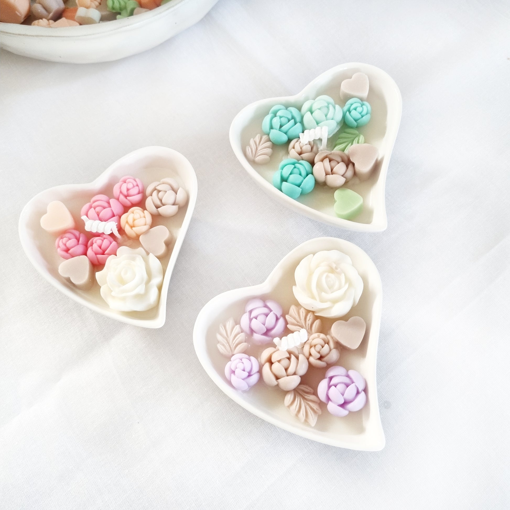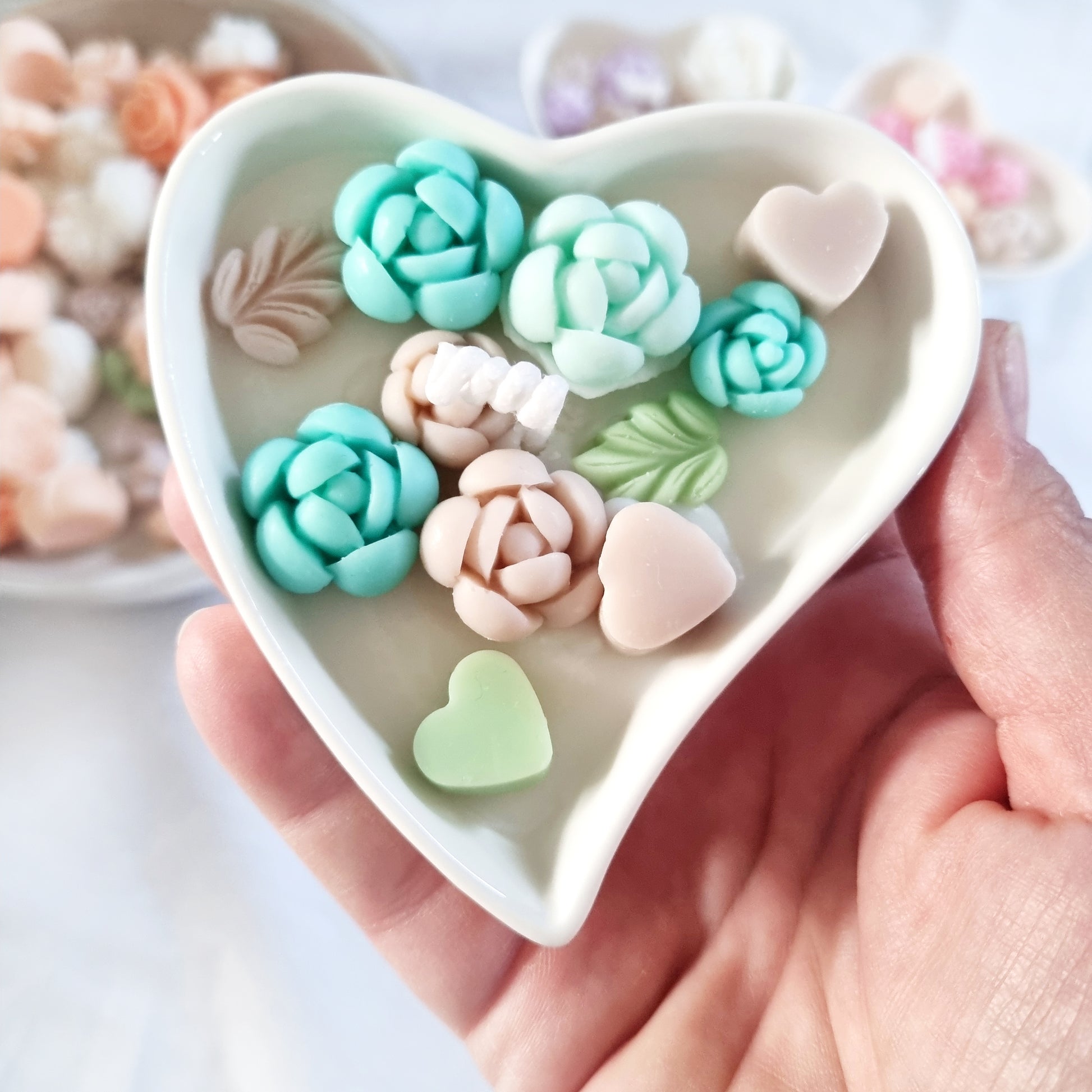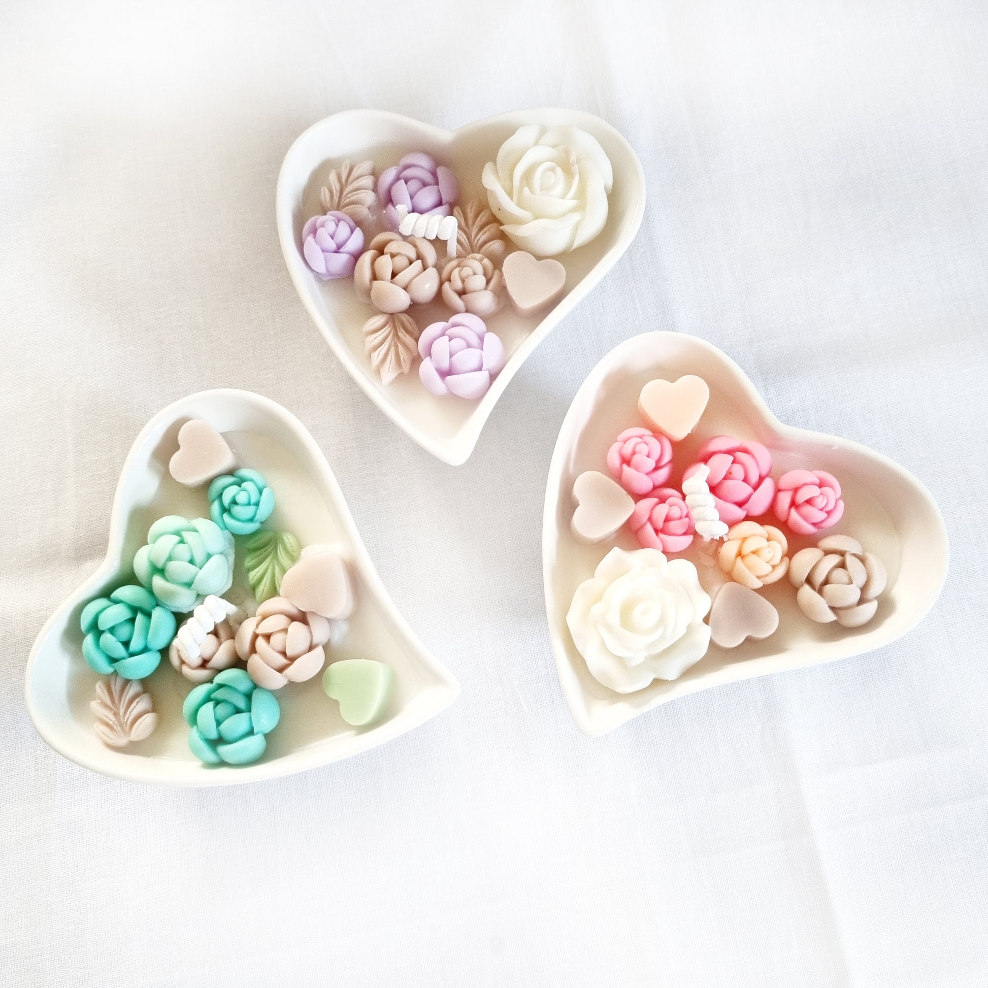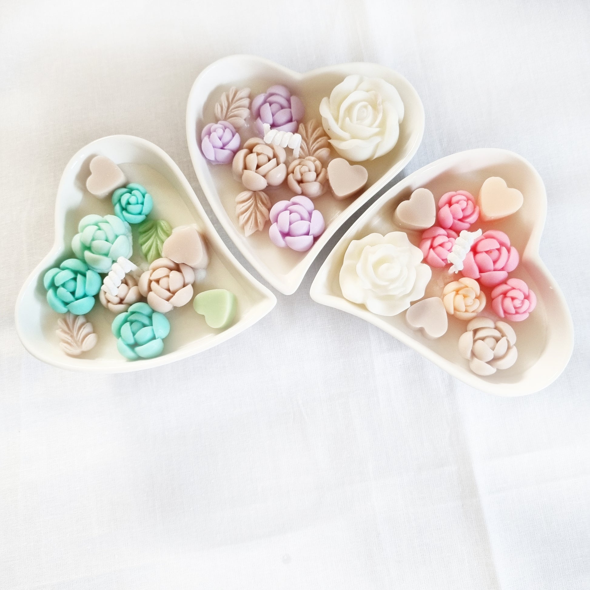 vegane Sojakerze mit Blüten in dekorativer Herzschale