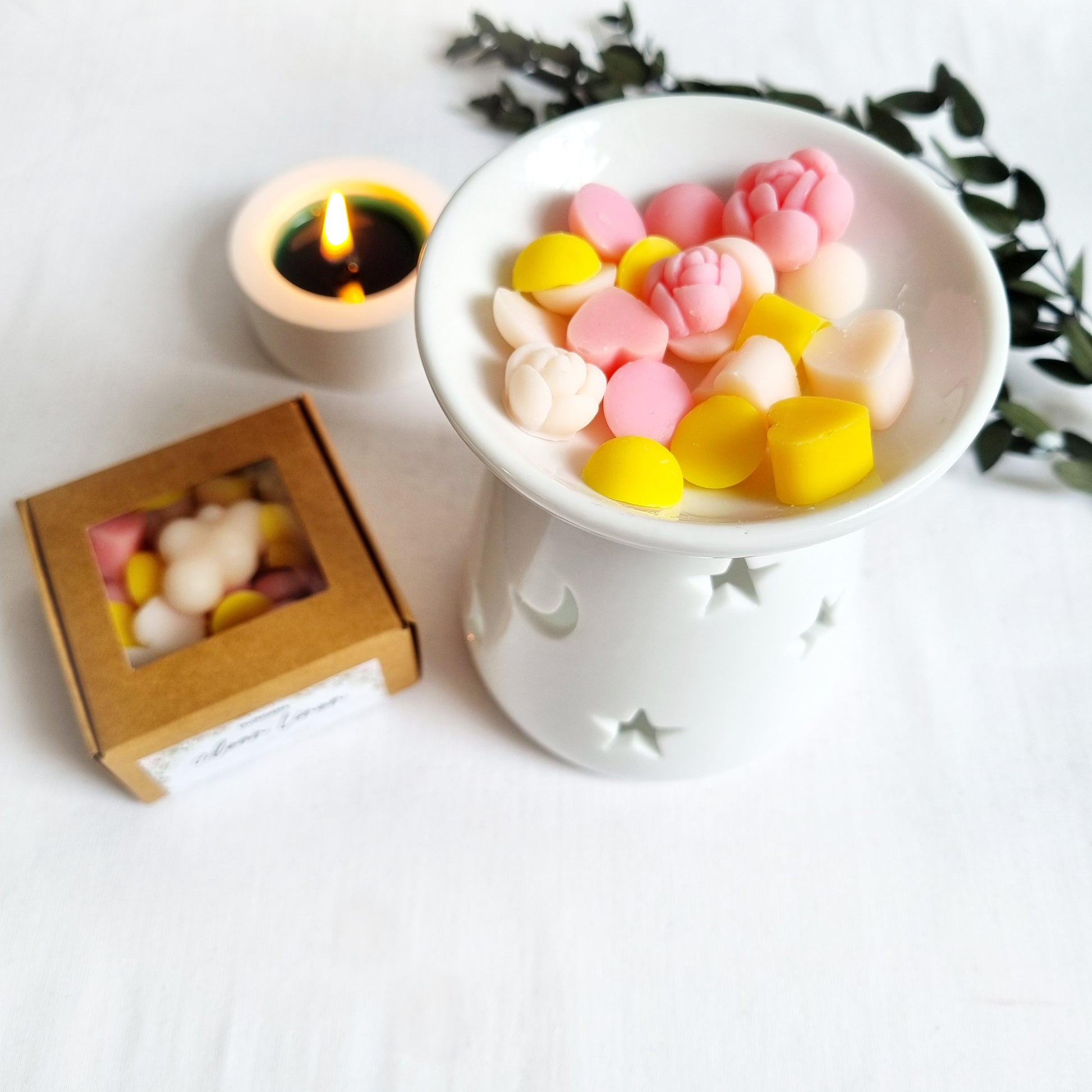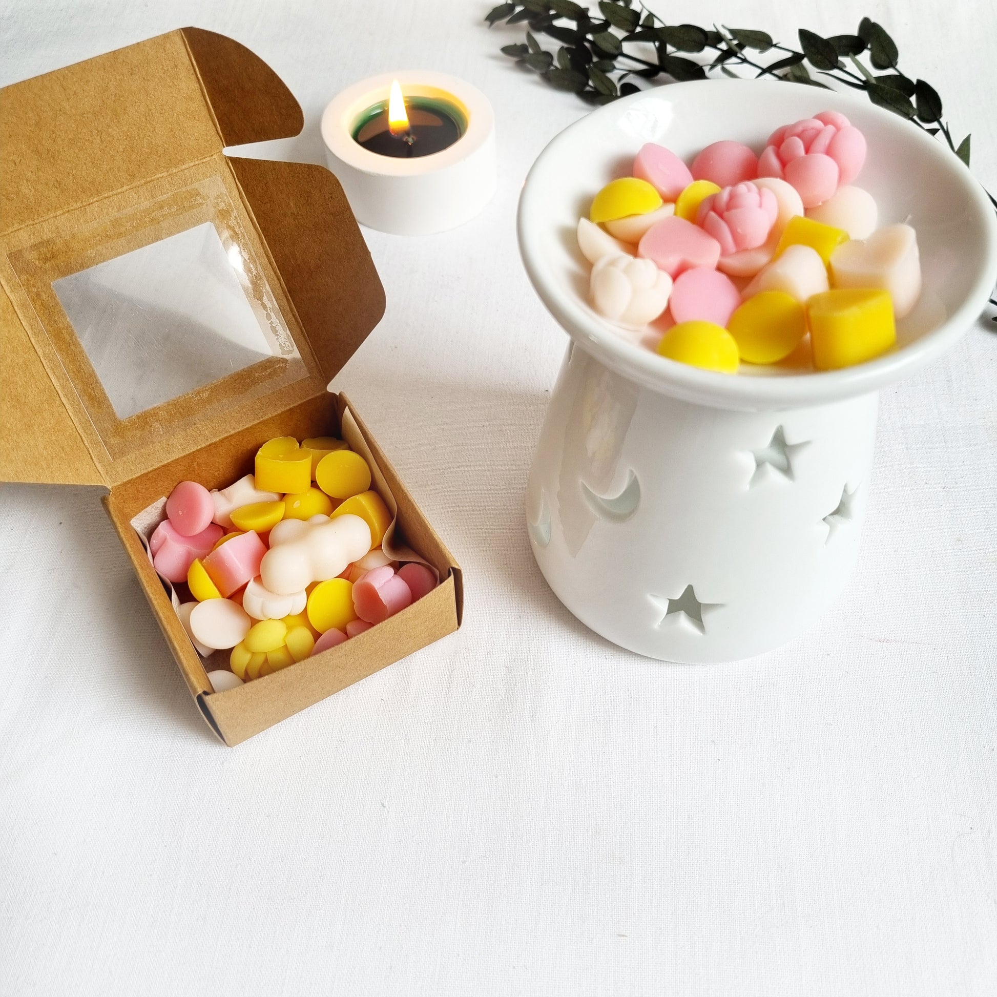 Die Duftmelts sind aus Sojawachs mit eine Duftanteil von 10%. Eine Packung enthält 40 Gramm Duftwachs. Habt ihr besondere Farbwünsche oder möchtet ihr eine größere Stückzahl, so gebt uns gern Bescheid.