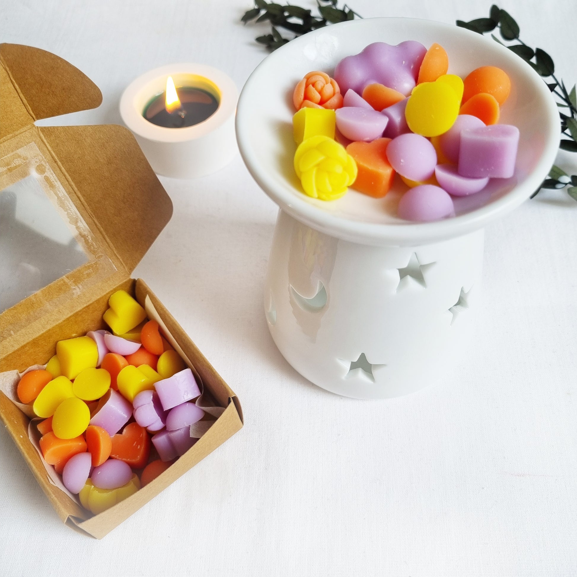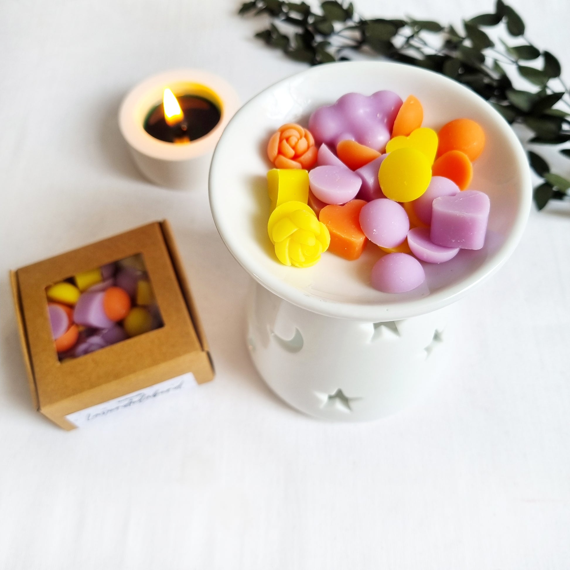 Die Duftmelts sind aus Sojawachs mit eine Duftanteil von 10%. Eine Packung enthält 40 Gramm Duftwachs. Habt ihr besondere Farbwünsche oder möchtet ihr eine größere Stückzahl, so gebt uns gern Bescheid.