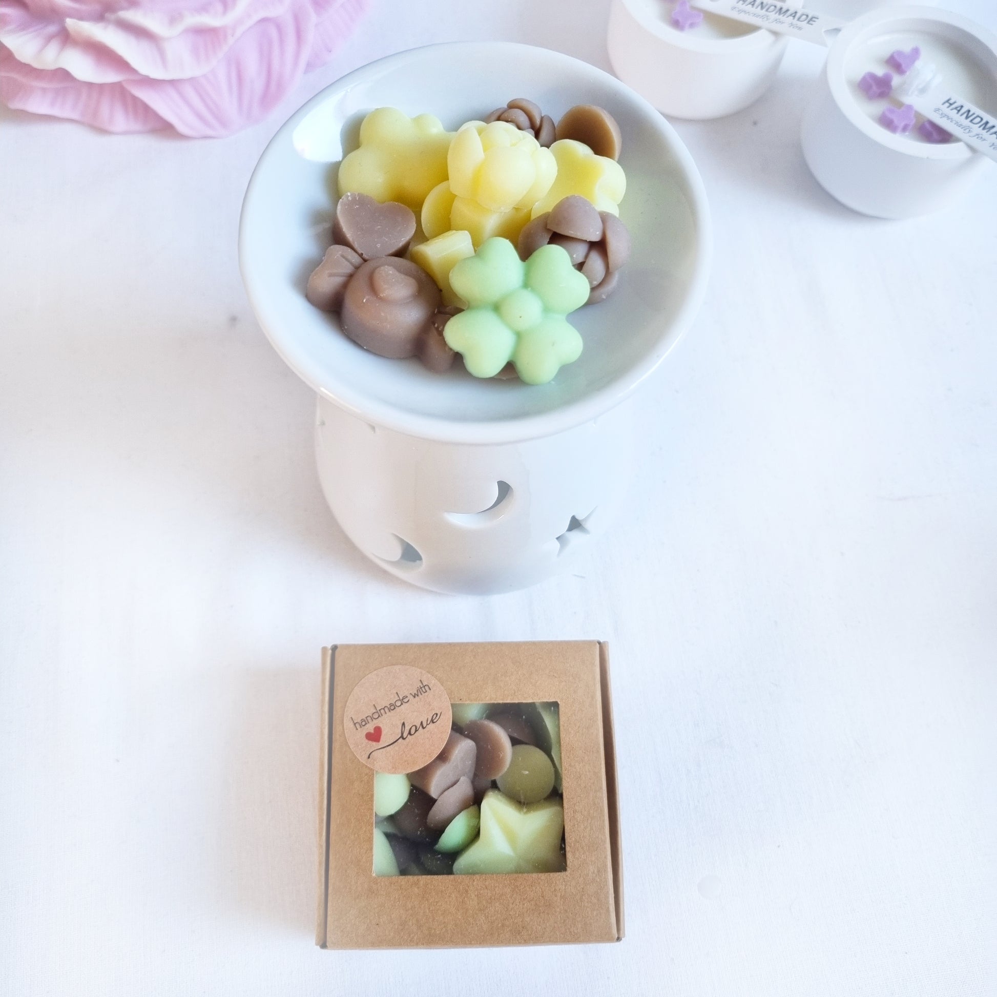 Die Duftmelts sind aus Sojawachs mit eine Duftanteil von 10%. Eine Packung enthält 40 Gramm Duftwachs. Habt ihr besondere Farbwünsche oder möchtet ihr eine größere Stückzahl, so gebt uns gern Bescheid.